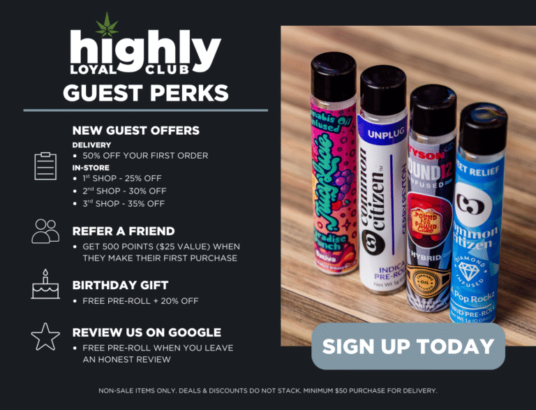 Members can also refer friends for a $25 (500 Points) reward per friend. There is no limit to how many friends you can refer, simply that your friend sign up for Highly Loyal Club and makes a purchase with LIV Cannabis, Pure Lapeer, and/or Xplore Cannabis. Friends must use the link that was sent by a Highly Loyal Club member.